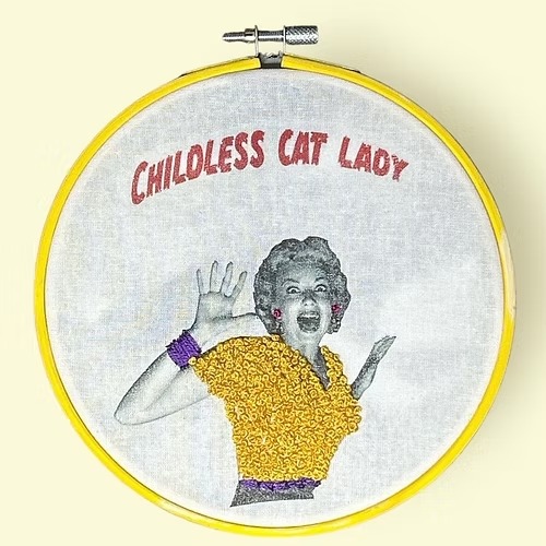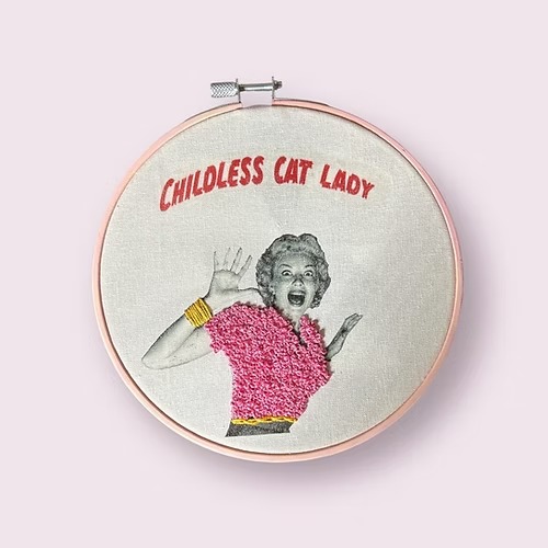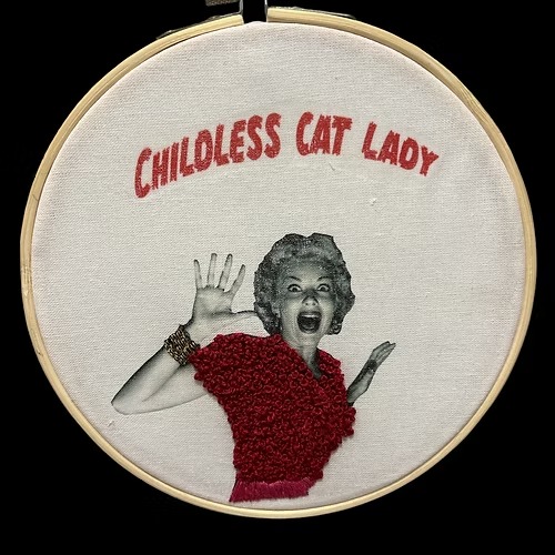 From my “Childless Cat Lady” Collection. Heat transferred image on 100% cotton, with hand stitched embroidered pattern with DMC embroidery thread.