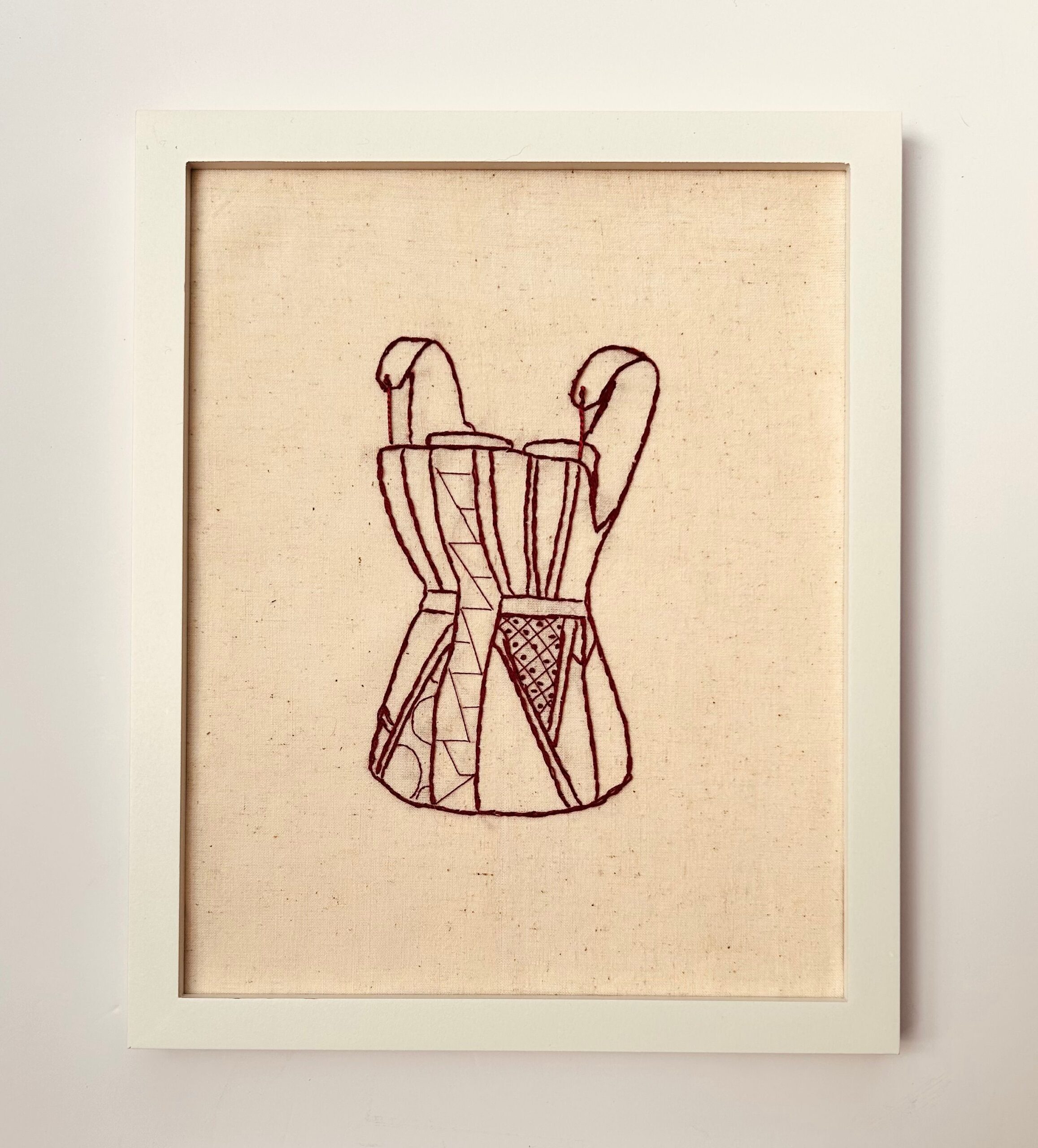 Inspired by late 19th-century corsetry, this piece invites a conversation between fashion history and feminist textile art. Clean lines and graphic stitch work bring a modern sensibility to a historical subject.